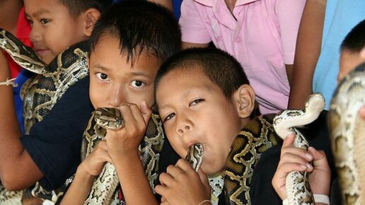 В Таиланде есть деревушка на 140 домов, где у каждого жителя в качестве питомца – настоящая ядовитая змея. И каждый с детства знает, как с ней управляться, чтобы не забаловала. Деревушка под названием Бан Кок СаНга прозвана местными деревней заклинателей змей. Правда кобры тут не у всех, некоторые заводят питонов. Говорят, у них нрав добрее, если можно так про змей. Как протекает жизнь в змеиной деревне Шоу «схватка человека и змеи» - обыденное зрелище на улочках деревни. Тут показывают шоу для туристов за небольшую плату...