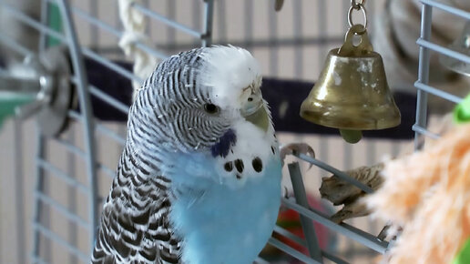 Волнистый попугайчик Кеша играет с колокольчиком.