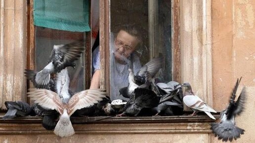 Кормление голубей во дворе.