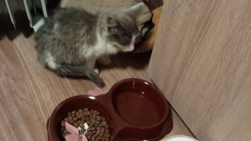 Сидела она в уголке под стулом маленькая, худенькая и жалкая до невозможности. Уже дома мы заметили, что ходит она с подкашивающимися задними лапками. Слабая была, лёгонькая как пушинка. В приют она попала вместе со своими сёстрами из какого-то дома, где её кормили собачьим кормом и было много собак, в первые дни в приюте она выглядела ещё хуже. Глазки пустые, безжизненные. Измождённый вид, было заметно, что котёнок не доедал. В первые дни мы его помыли, определили место, где он будет спать и принимать пищу...