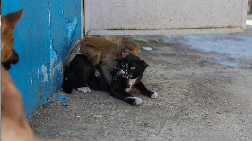 Кошка защитила друга обезьяну от собаки