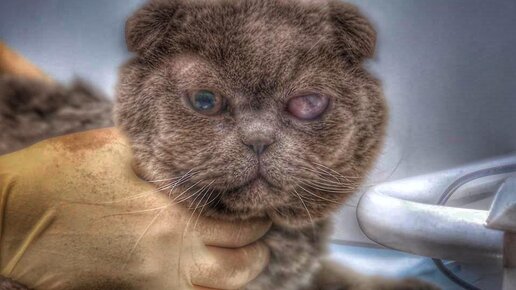 Как кот мог быть брошен в таком состоянии?! Ведь кто-то же дотянул до этого.. Один из глаз малыша кажется скоро ЛОПНЕТ! Он значительно выпирает из век! Естественно свою функцию он давно НЕ НЕСЁТ! Это развивалось не один день и даже не месяц, а кот породистый, на улице он не прожил бы и недели! Котик ЕЛЕ передвигается. Одна из грудных конечностей серьезно искривлена! Что там? Перелом? Если перелом то как давно? Пока не известно, но наступать он на это лапку опасается, наверное ему очень больно....