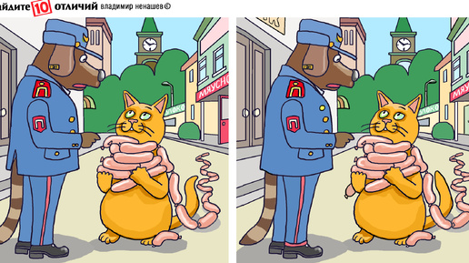 10 отличий. Тест на внимание про сказочный город, кота и сосиски. Позитив с юмором.