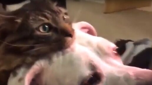 Кот сидя на собаке, вместе с ней любуются жизнью рыбок в аквариуме. Удивительная терпимость двух разных животных, очень не уживчивых между собой в природе, не такая уж и редкость, если они в качестве питомцев человека, выросли вместе с самого рождения...