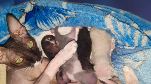 Два месяца ожидания, а точнее 69 дней. И вот они появились на свет, котята донские сфинксы. Прошлая ночь была волнительной. В моем питомнике Моника родила четверых очаровательных котят. Трое взяли окрасы мамы и её линии - два чёрных биколора и один голубой биколор. Четвёртый малыш белый, взял окрас по линии папы. После анализа родословной отца и генетики, думаю, белый сфинксик чуть позже будет приобретать окрас блю пойнт. Понаблюдаю за ним и расскажу вам о том, как мы растём. Когда это началось...