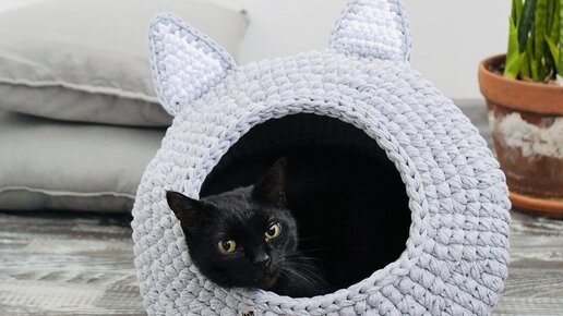 Хотите приобрести своему любимцу домик, но магазинные варианты слишком дорогие? Почему бы не связать его крючком? Ловите подборку! Домик №1 Можно сделать домик для кота в виде вот такой мышки. Здесь достаточно большой вход, ушки и хвост провязаны отдельно, а затем пришиты к основе. Для вязания лучше использовать трикотажную пряжу или полиэфирный шнур серого цвета, чтобы получилось правдоподобнее. Вход в дом дополнительно обвязан по периметру для придания ему формы. Домик №2 Если у вас есть пряжа или шнур двух цветов, то можно связать дом для питомца в полоску, так будет интереснее смотреться...