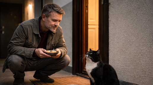 Сосед уверял, что “ненавидит котов”. Пока один не начал ночевать именно у его двери