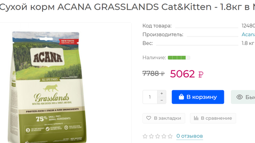 Купить сухой корм ACANA GRASSLANDS Cat&Kitten - 1.8кг в Москве: цены, отзывы, доставка
