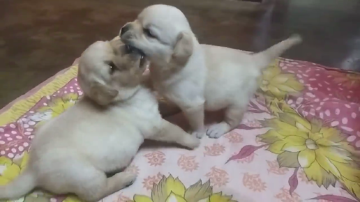 Лабрадоры играют, толкая друг друга на одеяле. Маленькие щенки вступают в контакт, которая быстро перерастает в драку. Малыши кладут лапы друг на друга и кусают друг друга. Больший из них, с более светлым оттенком, кажется, выигрывает...