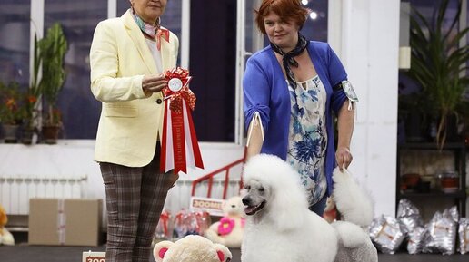 Кажется все началось с того, что моя белая красотка закрыла все титулы, которые могла. Юный чемпион России, Чемпион России, Чемпион Федерации, и даже съездила в Белоруссию и выиграла там Чемпиона Беларуси. Представляете, она ездила в Беларусь, а я нет! Меня она оставила дома работать, потому что кто-то должен оплачивать ее бесконечные счета. На фото выше, собственно, моя Ассоль, наш самый лучший хендлер - Пуделистка и эксперт выставки. В какой-то момент я думала повязать ее с каким-нибудь прекрасным серым принцем с алым ошейником и я начала присматривать женихов...