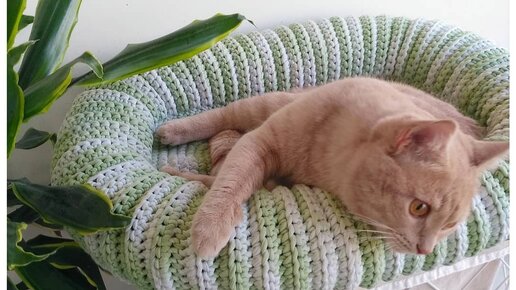 Эту лежанку я вязала Ваське, когда он был еще котёнком , спал в ней и днём и ночью , очень любил) а потом вымахал размером с тигра и перестал помещаться )) Пришлось отдать маленькой соседке) Оставлю для вас описание, вдруг кто-то захочет связать похожую своему питомцу😉 Размеры примерные, столбики и ряды не считала, опишу принцип. ° для начала вяжем основание - дно, я делала в форме прямоугольника с закругленными углами обычными ст без накида, примерные размеры 45*30 см,это ровно 1 моток пряжи 100-110 м...