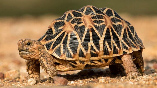 Лучистая черепаха Astrochelys radiata - довольно крупная рептилия, размер панциря может достигать 40-50 см. У лучистой черепахи в соотношении с разными видами довольно огромные и высокие лапы, из-за чего их не зря называют «слонами». Темный изогнутый панцирь черепах Astrochelys radiata как бы нарисован желтыми спиральными линиями, идущими от самой высокой точки каждого щитка, подобными лучам. Это оттенок панциря, который определяет название вида. Оттенок пластрона матовый, к тому же украшенный различными полосами...