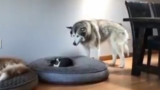 Смотрим и наслаждаемся: маламут обнаруживает, что его лежанка занята котом