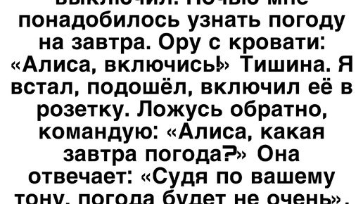 Купили умную колонку. Ребёнок наигрался и выключил. Ночью мне понадобилось узнать погоду на завтра. Ору с кровати: «Алиса, включись!» Тишина. Я встал, подошёл, включил её в розетку...