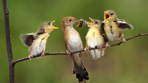 Мама зяблик кормит подросших птенцов