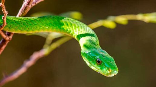 А знаете, что это за симпатичная зеленая змейка? Это зеленая мамба. Есть целый род змей, которые относятся к мамбам, но вот зеленая самая небольшая. Самая большая, которую удалось зарегистрировать была 2 метра длиной. А вообще, при средней длине «по джунглям» она не вырастает больше полутора метров. Как и все опасное – она красива. Змея покрыта чешуйками, которые переливаются изумрудно зеленым, с разнообразными оттенками от голубого до желтого, цветом. Самые молодые представительницы данного вида имеют ярко салатовую окраску...
