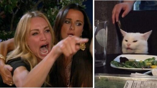 Около года назад ленты социальных сетей стали пестрить мемом из двух склеенных фрагментов. На фотографии изображены две девушки, одна из которых плачет, пытаясь что-то доказать коту, сидящему за столом. Изначально, фотография с белым котом была опубликована в июне 2018 года. Хозяин фотографии поделился ею в социальных сетях, пояснив, что его кот не любит овощи. Впоследствии фото стало набирать популярность и разнеслось по просторам интернета. Второй фрагмент известного ныне мема — кадр из сериала «Настоящие домохозяйки Беверли-Хиллз»...