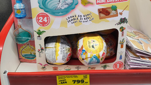 Пошли мы с МЧ в выходной в "Магнит Аптеку". Забрали заказ. И решили заодно зайти в универсам "Магнит" (они в одном здании). Кое-что купили. Отправились на кассу. Пока МЧ был в очереди, я глядела по сторонам. И что я заметила напротив кассы? Шары Mini Verse! Вообще не ожидала их там встретить. Даже в "Ленте" такого нет! Образцы пока не отодрали! В ДМ часто они отсутствуют...