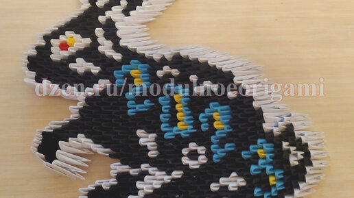 Здравствуйте, Друзья! Наступает Новый 2023 год-год черного кролика. В связи с этим сегодняшний мастер класс хочу посвятить именно КРОЛИКУ. Список мастер классов. Модули в цифрах 2023 можно заменить на черные. Для изготовления кролика нам понадобится 597 модулей: 304 черных, 226 белых, 53 голубых, 13 желтых и 1 красный. Цвет модулей можете выбрать на свое усмотрение. Как собирать модули, можно посмотреть здесь. Все модули будем собирать широкой стороной вверх. Собирать кролика начнем с головы. Первый ряд 3 белых модуля...