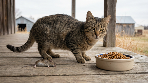 Кошка живёт в частном доме, гуляет на улице, ловит мышей, птиц, приносит добычу на крыльцо. Вы думаете — она же сама себя кормит, зачем ей миска с кормом. Перестаёте насыпать еду или даёте символически, горсть раз в день. Через месяц замечаете — кошка похудела, шерсть стала тусклой, появилась вялость. Или наоборот — кормите кошку как обычно, два раза в день полными мисками, а она всё равно охотится, таскает мышей, не ест корм. Вы в растерянности — перекармливаю или она голодная? За двадцать лет я видела десятки таких случаев...
