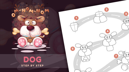 Всем привет! Сегодня нарисуем милую собачку с костью. Используя простые формы, мы создадим яркого и запоминающегося персонажа. Давайте начнем) Возьмите карандаш и лист бумаги. Мы начинаем! Шаг 1 Делаем набросок головы и намечаем линию глаз Шаг 2 Рисуем мордочку собаки Шаг 3 Рисуем нос глаза и зрачки Шаг 4 Рисуем тело и большие уши Шаг 5 Рисуем передние лапы Шаг 6 Рисуем задние лапы для нашего песика Шаг 7 Дорисовываем задние лапы, хвост, брови и кость...