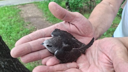 А вот со стрижами сложнее. Анатомия птиц такова, что взлететь с земли стриж не может и ему нужна помощь. Этого бедолагу мы нашли на газоне у магазина. Посмотрели, вроде травм нет. По оперению понятно, что птица молодая, но уже не пуховый птенец, т.е. есть шанс, что он умеет летать...