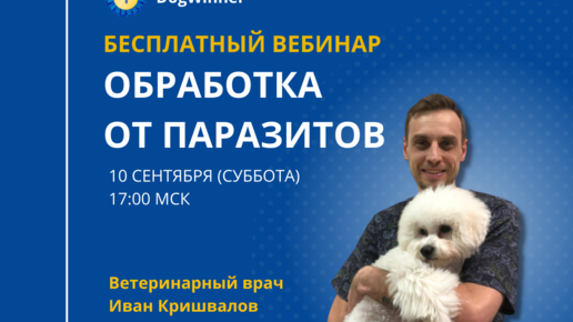 НОВЫЙ БЕСПЛАТНЫЙ ВЕБИНАР DogWinner ДЛЯ ВЛАДЕЛЬЦЕВ СОБАК ❓ Как уберечь питомца от паразитов на даче или в городской квартире? Как произвести обработку так, чтобы не навредить здоровью и обеспечить собаке надёжную защиту? Один вечер погружения в тему об обработке питомцев с ветеринарным врачом Иваном Кришваловым 💥 Суббота, 10 сентября, 17:00 ИВАН КРИШВАЛОВ Практикующий ветеринарный врач, эксперт закрытого клуба владельцев собак DogWinner. В 2004 году окончил ветеринарно-санитарный факультет Московского Государственного Университета Прикладной Биотехнологии...