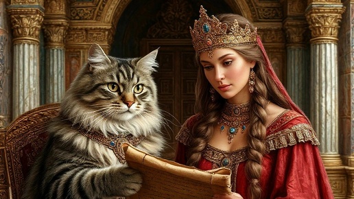 Царица Марья приехала в древний город Пальмиру, вошла во дворец Зенобии воинственной, нашла тайник и произнесла волшебное слово, которое знали только царицы амазонок и ларец раскрылся перед ней. О ужас!!! О разочарование!!! Вместо доспехов - шита и меча, диска и сагариса в ларце лежал свиток пергамента с буквами на незнакомом языке. Никто тот свиток не прочтет Никто ни слова не поймет Ни князь, ни царица Ни амазонка красная девица Храбрая лихая поляница. "Не печалься мур-светлая царица" - мурлыкнул Кот Баюн - "я мяу счас принесу тебе кое-какое чудо"...