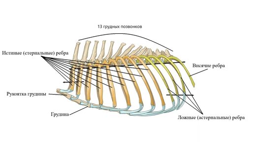 Грудная клетка образована грудным отделом позвоночника, ребрами и грудной костью. В целом имеет бочкообразный вид с округлым входным отверстием и широкими межреберными промежутками. Ребра. Парные, дугообразно изогнутые кости. Число пар ребер соответствует числу грудных позвонков. Вместе с грудными позвонками, ребра и грудная кость формируют грудную клетку. На ребре различают: позвоночный конец, тело и грудинный конец. Грудная кость. Непарная кость осевого скелета. Замыкает грудную полость с вентральной,...