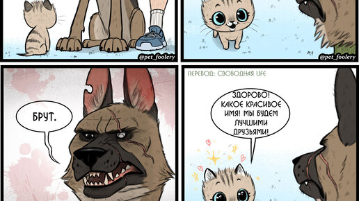 Животные, особенно когда они маленькие, вызывают умиление! Вообще, домашние животные очень искренние, забавные и добрые. Многие художники рисуют своих питомцев, пофантазировав, о чем они думают или как бы поступили в определенной ситуации. Автора этой серии зовут Бен Хед, он карикатурист. Бен создает милые комиксы о дружбе маленького котенка Пикси и большой немецкой овчарки Брута. Эти работы обязательно вызовут улыбку на вашем лице, ведь они просто пропитаны добротой! "Пикси - крошечный, радостный и энергичный котенок...