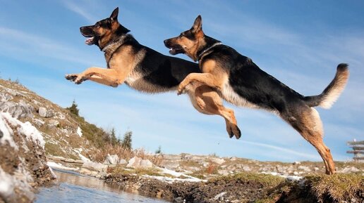 Человек на протяжении тысячелетий очень зависел от охоты. Нам очень повезло, что удалось встретить собак. Они являются животными, которые хорошо охотятся. Люди смогли приучить собак и вывели разные породы. Среди них часто выделяют овчарок, которые являются верными псами. Они надёжно стерегут дом и помогают людям во время охоты. Как же овчарки умеют хорошо прыгать! Только посмотрите на это. Какие красивые прыжки получаются: 1) Во время снегопада бежать непросто, но возможно. Чувствуется, что эта собака уже преодолела немалое расстояние...