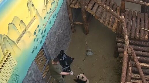 Московский зоопарк показал, как панда Катюша помогает киперам убирать вольер