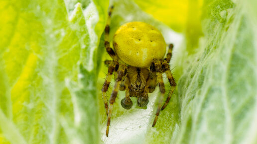 Четырехпятнистый крестовик (Araneus quadratus) c желтым брюшком, устроившийся среди листьев. Интересно, что этот паук обладает способностью изменять свой цвет в зависимости от окружения. Это процесс занимает три дня (1).