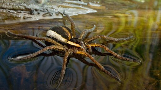 Каёмчатый охотник: Крупный паук, который обитает на реках и озёрах по всей России. Он умеет ходить по воде и ловить рыбу!