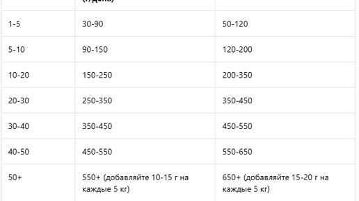 Пожалуйста, помните, что это ОЧЕНЬ ОБЩИЕ РЕКОМЕНДАЦИИ. Точное количество корма всегда зависит от множества факторов, и самый надежный источник информации — это упаковка конкретного корма, который вы используете, а также консультация с ветеринарным врачом...