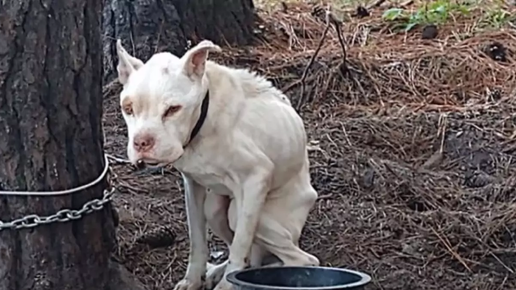 Эта история произошла в Джорджии. Как рассказали очевидцы, питбуль никогда не покидал это место, куда его определил хозяин. Пёс жил, привязанный к дереву с помощью цепи, которая была слишком коротка. Так что собака всегда сидела сгорбившись. Когда питбуль начал заметно чахнуть, его судьбой озаботились соседи, которые связались с приютом Go Dogs Go Rescue, чтобы привлечь общественность. Ведь пса нужно было спасать. На момент спасения собаке весила всего 11 килограммов. Питбуль выглядел, как больной забитый пёс непонятной породы...