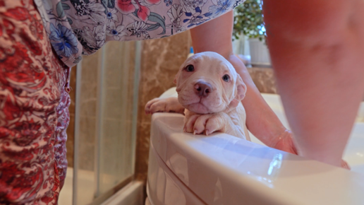 Два щенка моются в ванной и ведут себя совершенно по разному.