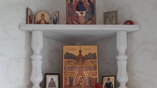 Несколько лет назад мы с семьей перевешивали на кухне иконы и решили, что нам нужна угловая полка. Квадратный мебельный щит, три балясины и декоративная планка. Пара часов работы и полка готова. Покраска обычной акриловой краской...
