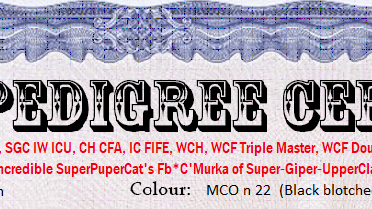 Сведения о кошке (продолжение) В предыдущей статье мы примерно разобрались, из чего состоит имя кошки по родословной, закончив разбор на такой прекрасной части, как выставочные титулы. К сказанному можно добавить еще несколько штрихов. При анализе имени кошки далеко не всегда очевидно, что именно стоит перед кличкой - почетное звание (титул), префикс, указывающий на страну происхождения, буква алфавита или неотъемлемая часть имени. Допустим, захотелось заводчику назвать котенка SC'Line, он и назвал,...