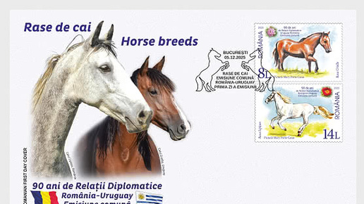 Romfilatelia и Romanian Post запускают в обращение, совместный выпуск марок Romania – Uruguay с темой для коллекционеров: ПОРОДЫ ЛОШАДЕЙ. Выпуск, посвящен годовщине 90-летия дипломатических отношений, состоит из двух почтовых марок, блока из двух перфорированных почтовых марок, конверта первого дня и сувенирного набора с особым коллекционным товаром в ограниченном тираже. Среди множества известных пород лошадей почтовые марки с номиналами 14 лей и 8 лей изображают две из них: румынскую липицанку и лошадь криолло из Уругвая...