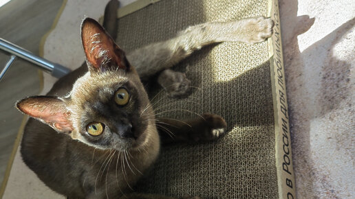 Почему мы выбрали именно бурму. Я проштудиповала весь интернет в поисках идеальной породы. Требования покупателя были следующие : 1.Отсутствие подшерстка. Как следствие нет шерсти в еде, на диванах и вообще везде. 2.Добрая, контактная, привязаная к человеку. 3.Умная, с высоким кошачьим интеллектом. Чтобы лоток и когтеточка были на отлично. В доме свежий ремонт. Любит вот эту, а вот вертикальная его пока не интересует. Домиком, кстати, тоже не пользуется. В качестве лежанки использует мягкий коврик на кухне...