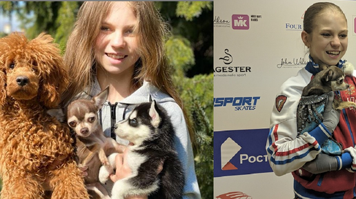 Три собаки Александры Трусовой, одна из которых надевает те же наряды, что и фигуристка