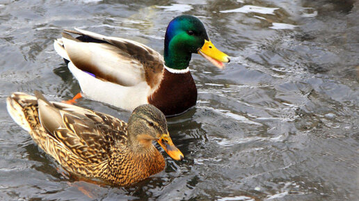 Кряква Это самая распространенная порода дикой утки. Тело крепкое и длинное, достегает 60 см в длину. Шея и голова селезня выделяется изумрудно-перламутровой окраской. Перья на голове и шее имеют гладкую структуру. Шейная часть отделяется белым ободком. Самки кряквы отличаются от селезня размерами и окраской. Кряквы женского пола редко достигают в длину 50 см, имеют бурую окраску с небольшой пестриной. Такое оперение позволяет ей хорошо прятаться в камышах и высокой траве. Кряква — селезень и утка...