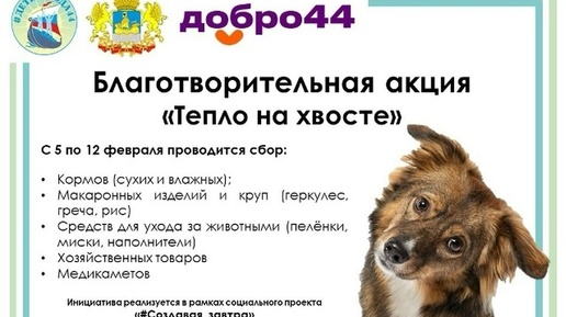 5 февраля в Костроме стартовала благотворительная акция по сбору кормов в приюты для животных «Тепло на хвосте», сообщает региональный комитет по делам молодёжи. Её проводят активисты #Детигорода44 совместно с региональным центром развития добровольческой деятельности Костромской области. Пункты сбора кормов могут организовать все желающие. Для участия в акции в учреждении – например, в школе, ссузе, вузе, библиотеке, молодёжном центре или другой организации – нужно установить коробку для сбора корма и средств для ухода за животными...