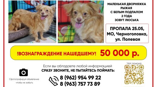 Нужна расклейка объявлений, нужны люди на поиски, нужны репосты, нужна огласка в районные чаты Черноголовки, нужно сообщить знакомым и родственникам, кто живет рядом. Пожалуйста, умоляем, помогите найти Люську!🙏🏼 ❗️🔴Последний раз Люську видели в деревне Ботово(М.О. Черноголовка). Если вы можете помочь. Вступите, пожалуйста, в чат поиска...