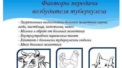 Проблема распространения туберкулеза среди людей и животных приобрела большое значение. Туберкулезом болеют не только люди, но многие животные и птицы, что необходимо учитывать при проведении мероприятий по профилактике этого заболевания среди населения. Бактерии туберкулеза, попадая в организм, длительное время могут находиться в неактивной форме. Кроме того, заболевание развивается в хронической форме и может не проявляться симптомами. Заражение туберкулезом человека в основном происходит воздушно-капельным...