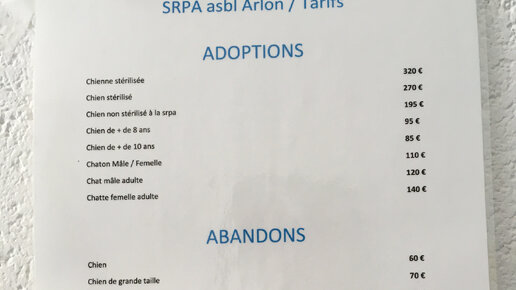 Уже писал о приюте для животных в Бельгии, как там все устроено Часть 1, Часть 2, Часть 3. А теперь мне переслали ценник из этого приюта. Что можно сказать... Чтобы "усыновить" стерилизованного пса, нужно заплатить 320 евро! За старую собачку, которой больше 10 лет - скромные 85 евро. Почему-то коты мальчики на 20 евро дешевле девочек. У нас хоть бы бесплатно брали. Если бы нашим людям озвучили такие ценники, то конкретно отпугнули бы их. Зато там на улицах нет бездомных животных, всех отлавливают, стерилизуют и пытаются найти им дом...