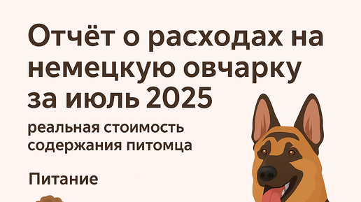 25 июля моя Альфа отметила 9-й день рождения 🎂🐶. В честь этого я подвёл итоги за июль — получился довольно затратный, но показательный месяц. 📌 Немного о питомце У щенков и активных собак расходы обычно выше, чем у спокойных взрослых. 🍖 Питание Июль стал одним из самых дорогих месяцев по кормлению — 9 245 ₽. 👉 Итого: 3 550 ₽. 🧼 Уход и груминг 💊 Лекарства и витамины 👉 Итого: 1 586 ₽. 🎾 Игрушки и аксессуары 👉 Итого: 580 ₽. 📊 Итоги за июль 2025 💵 Общие расходы: 16 171 ₽ Это самый...