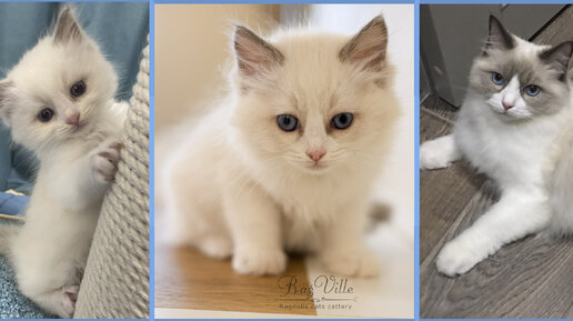 Общение с одной из подписчиц натолкнуло меня на мысль показать, как меняется окрас котят за первый год жизни. Как раз 29.09.2023 исполнился ровно год нашему предыдущему помету "А", с чем я еще раз поздравляю их владельцев и передаю большой привет! Показываю фото котят в 3 недели, в 3 месяца и в возрасте 10-12 месяцев. Axel RagVille. Окрас Blue lynx bicolor. Самый светленький, даже в три месяца маска на мордочке была еле видна: Albus Severus RagVille. Окрас Blue lynx mitted. Довольно редкий окрас у рэгдоллов, у нас в первый раз родились такие, и сразу два: Альбус и Амурчик...