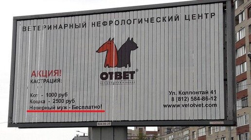 Одна из питерских ветеринарных клиник решила купить несколько рекламных мест, на которых разместили свою акцию, с шуткой о бесплатной кастрации неверных мужей.